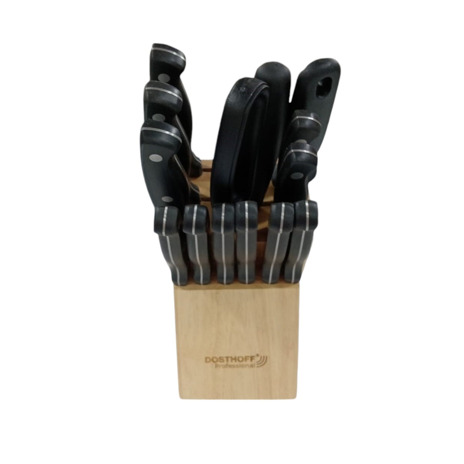 Upgrade your kitchen with the Dosthoff 14-Piece Knife Set, a perfect blend of precision, durability, and style. This premium set includes every knife you need for your culinary tasks, from a chef's knife and bread knife to paring knives and steak knives, all crafted from high-carbon stainless steel for exceptional sharpness and edge retention. Each knife features an ergonomically designed handle that ensures a comfortable and secure grip, allowing for precise control while cutting, slicing, or dicing. The set also includes kitchen shears, a honing steel, and a stylish wooden block for safe storage and easy access. Ideal for both professional chefs and home cooks, the Dosthoff knife set is an essential addition to any kitchen, combining timeless craftsmanship with modern design.