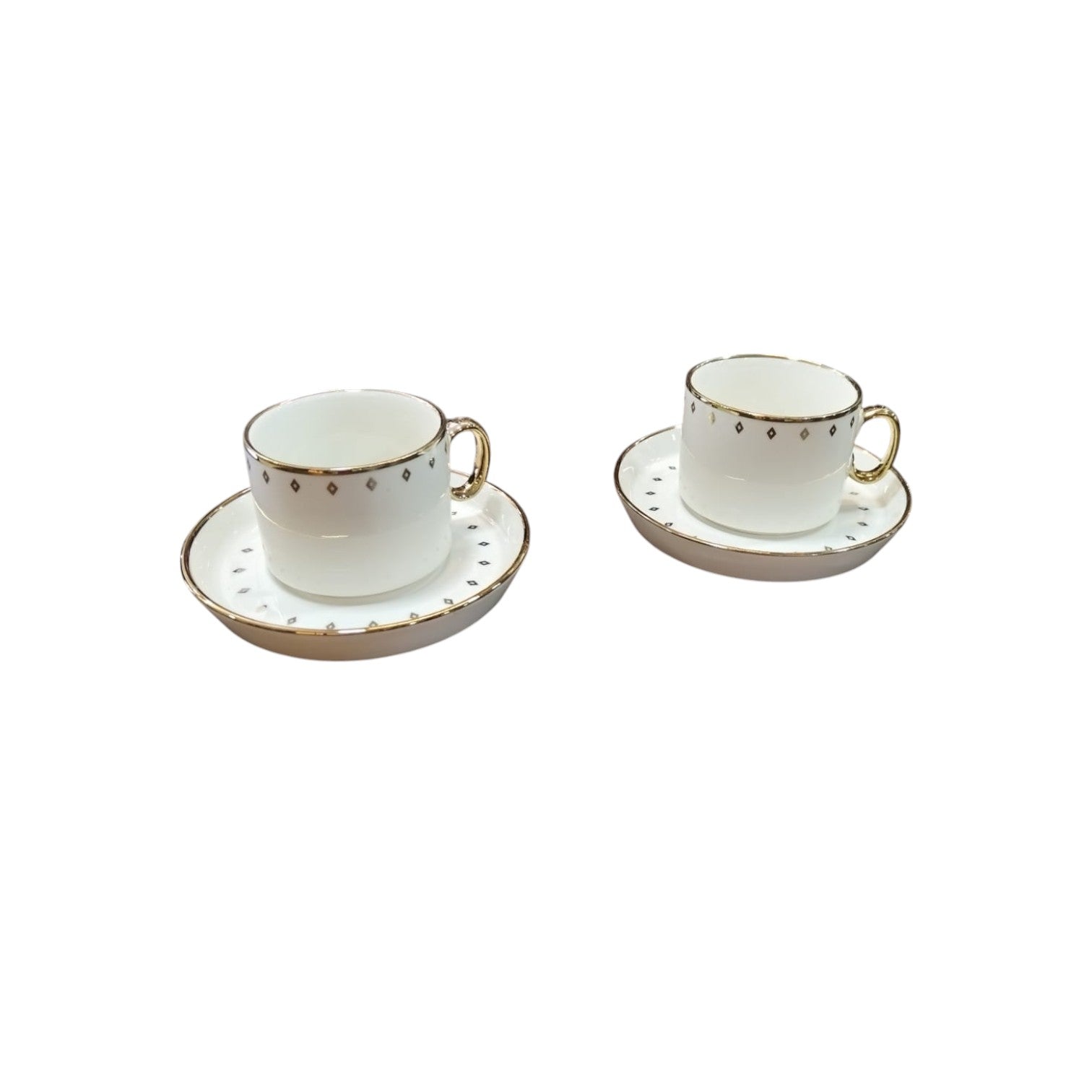 Tea Cup & Saucer Set: A classic demitasse pairing featuring a structured cup with a gold-plated handle and a matching saucer.